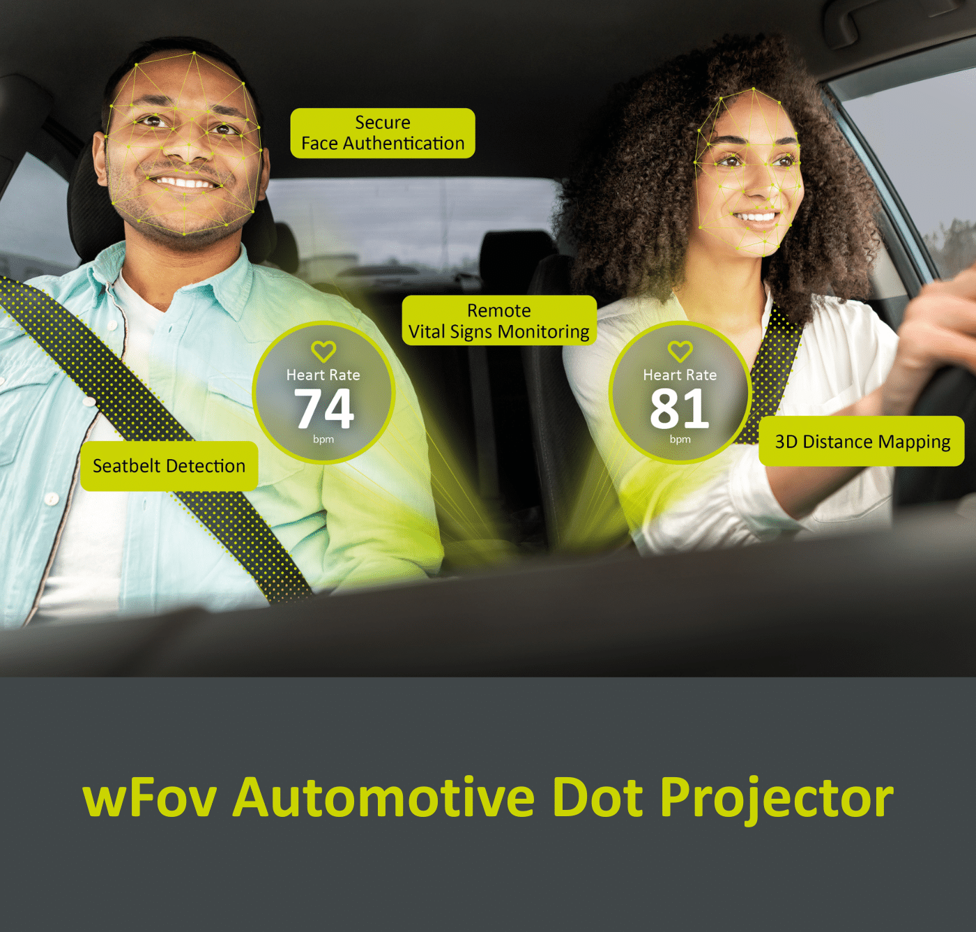 The trinamiX patented Biometric Imaging solution (Beam Profile Analysis) tracks the vital signs and biometrics of occupants using a camera and a laser projector installed behind the dashboard display to support a wide range of safety and comfort functions. Additionally, it creates a 3D depth map for optimized airbag deployment decisions and reliably detects whether the seat belt is fastened.
